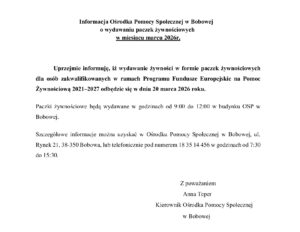 Informacja Ośrodka Pomocy Społecznej w Bobowej o wydawaniu paczek żywnościowych w marcu 2026 r.