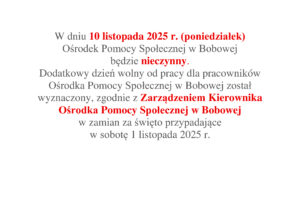10 listopada 2025 r. Ośrodek Pomocy Społecznej w Bobowej będzie nieczynny