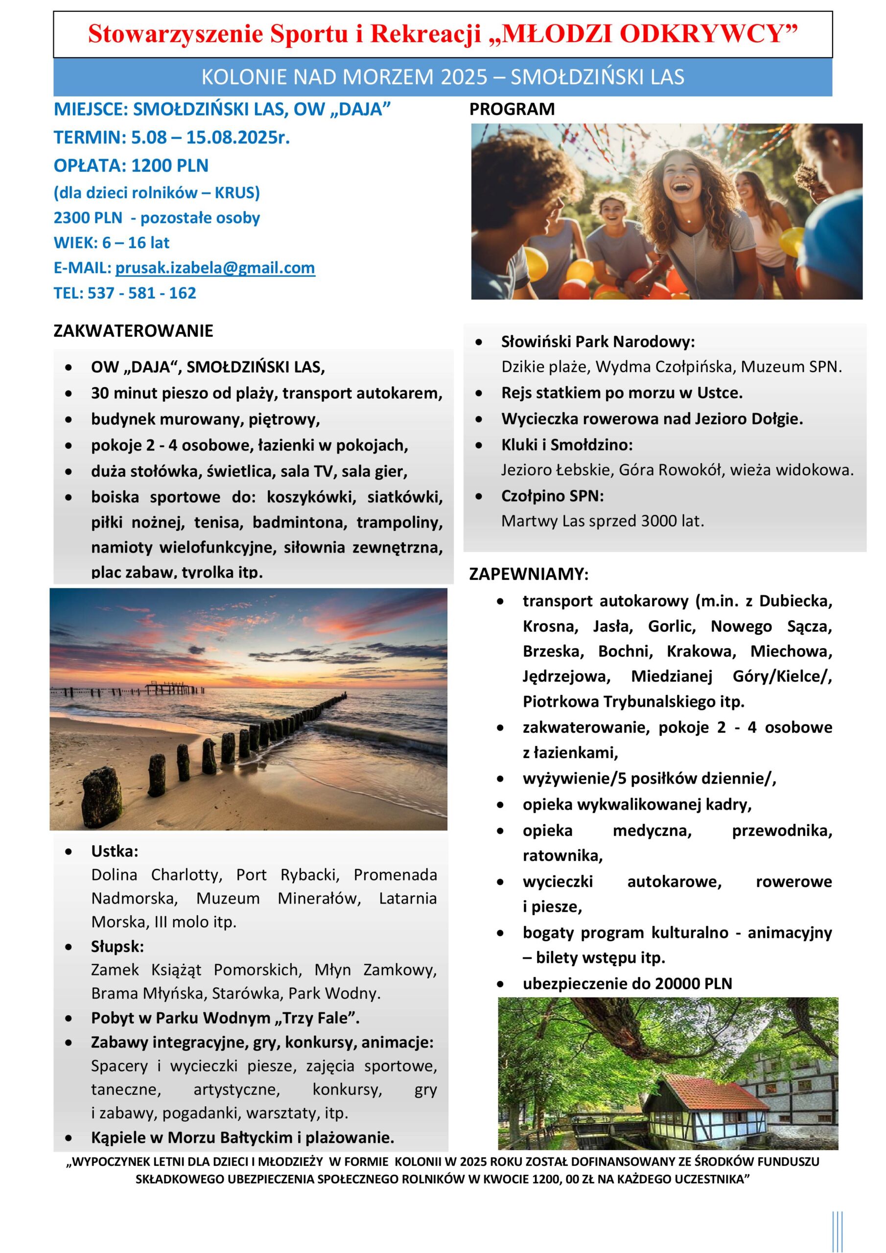 Stowarzyszenie Sportu i Rekreacji „Młodzi Odkrywcy” ma duże doświadczenie w organizacji kolonii edukacyjnych, sportowych, tanecznych, półkolonii, zielonych szkół oraz wycieczek dla dzieci i młodzieży. W tym roku zapraszamy do współpracy przy organizacji kolonii dla dzieci rolników dofinansowanych przez Fundusz Składkowy Ubezpieczenia Społecznego Rolników. Wyjazdy te realizujemy wspólnie z m.in. z Kuratoriami Oświaty, Urzędami Gmin, Ośrodkami Pomocy Społecznej i Szkołami.