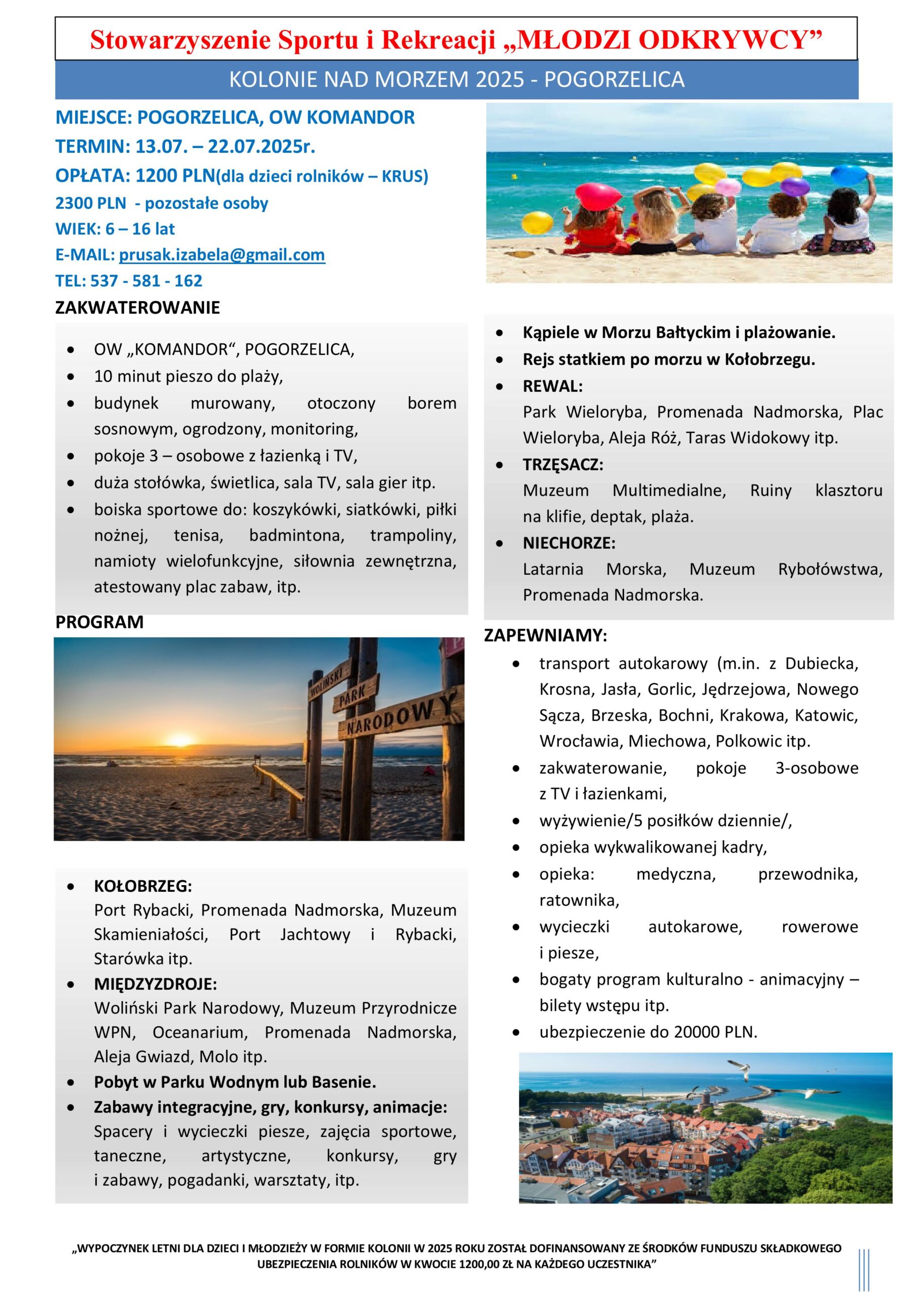 Stowarzyszenie Sportu i Rekreacji „Młodzi Odkrywcy” ma duże doświadczenie w organizacji kolonii edukacyjnych, sportowych, tanecznych, półkolonii, zielonych szkół oraz wycieczek dla dzieci i młodzieży. W tym roku zapraszamy do współpracy przy organizacji kolonii dla dzieci rolników dofinansowanych przez Fundusz Składkowy Ubezpieczenia Społecznego Rolników. Wyjazdy te realizujemy wspólnie z m.in. z Kuratoriami Oświaty, Urzędami Gmin, Ośrodkami Pomocy Społecznej i Szkołami.
